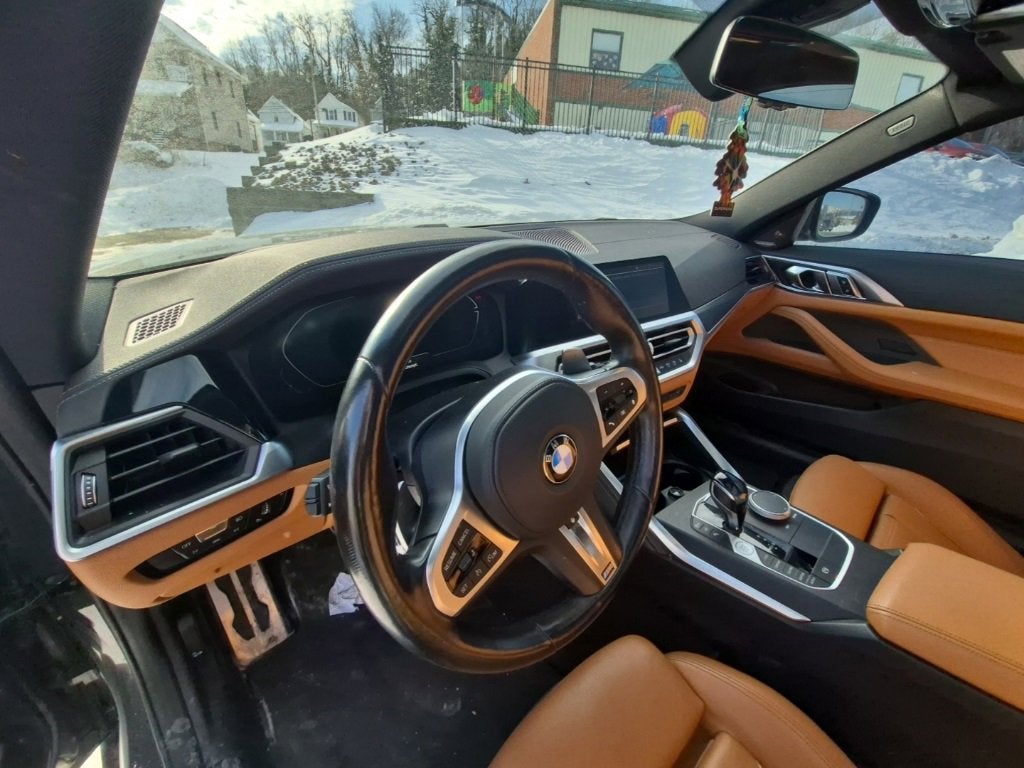 Local Owner, Active Park Distance Control, Ambient Lighting, Connected Package Pro, Head-Up Display, Heated Front Seats, Heated Steering Wheel, Live Cockpit Pro w/Navi, Navigation, Navigation System, Parking Assistance Package, Parking Assistant Plus, Power driver seat, Power Front Seats, Power moonroof, Power passenger seat, Premium Package (DISC), Remote Engine Start, SensaTec Upholstery, Surround View w/3D View. 2021 BMW 4 Series M440i xDrive Connected Package Pro, Parking Assistance Package (Active Park Distance Control, Parking Assistant Plus, and Surround View w/3D View), Premium Package (DISC) (Ambient Lighting, Head-Up Display, Heated Front Seats, Heated Steering Wheel, and Live Cockpit Pro w/Navi), Navigation, Navigation System, Power driver seat, Power Front Seats, Power moonroof, Power passenger seat, Remote Engine Start, SensaTec Upholstery, 10 Speakers, 4-Wheel Disc Brakes, ABS brakes, Adaptive M Suspension, Adjustable Seat Width, Air Conditioning, Alloy wheels, AM/FM Radio, AM/FM radio: SiriusXM with 360L, Apple CarPlay Compatibility, Auto High-beam Headlights, Auto-dimming door mirrors, Auto-dimming Rear-View mirror, Automatic temperature control, BMW Assist eCall, BMW TeleServices, Brake assist, Bumpers: body-color, Compass, ConnectedDrive Services, Delay-off headlights, Driver door bin, Driver vanity mirror, Dual front impact airbags, Dual front side impact airbags, Electronic Stability Control, Emergency communication system: BMW Assist eCall, Enhanced USB & Bluetooth®, Exterior Parking Camera Rear, Four wheel independent suspension, Front anti-roll bar, Front Bucket Seats, Front Center Armrest, Front dual zone A/C, Front reading lights, Fully automatic headlights, Garage door transmitter, harman/kardon Surround Sound System, Heated door mirrors, Hi-Fi Sound System, Illuminated entry, Knee airbag, Low tire pressure warning, Lumbar Support, Memory seat, Occupant sensing airbag, Open Pore Fine Wood Oak Grain Trim, Outside temperature display, Overhead airbag, Overhead console, Panic alarm, Passenger door bin, Passenger vanity mirror, Power door mirrors, Power steering, Power windows, Radio Control US, Radio data system, Rain sensing wipers, Rear air conditioning, Rear anti-roll bar, Rear reading lights, Rear seat center armrest, Rear window defroster, Remote keyless entry, Security system, SiriusXM w/360L, Speed control, Speed-sensing steering, Speed-Sensitive Wipers, Split folding rear seat, Spoiler, Sport Seats, Sport steering wheel, Steering wheel mounted audio controls, Tachometer, Telescoping steering wheel, Tilt steering wheel, Traction control, Trip computer, Turn signal indicator mirrors, Variably intermittent wipers, Wheels: 18 x 7.5 M Double-Spoke Bicolor, Wheels: 19 x 8 M Double Spoke Cerium Gray, WiFi Hotspot, and Wireless Charging.